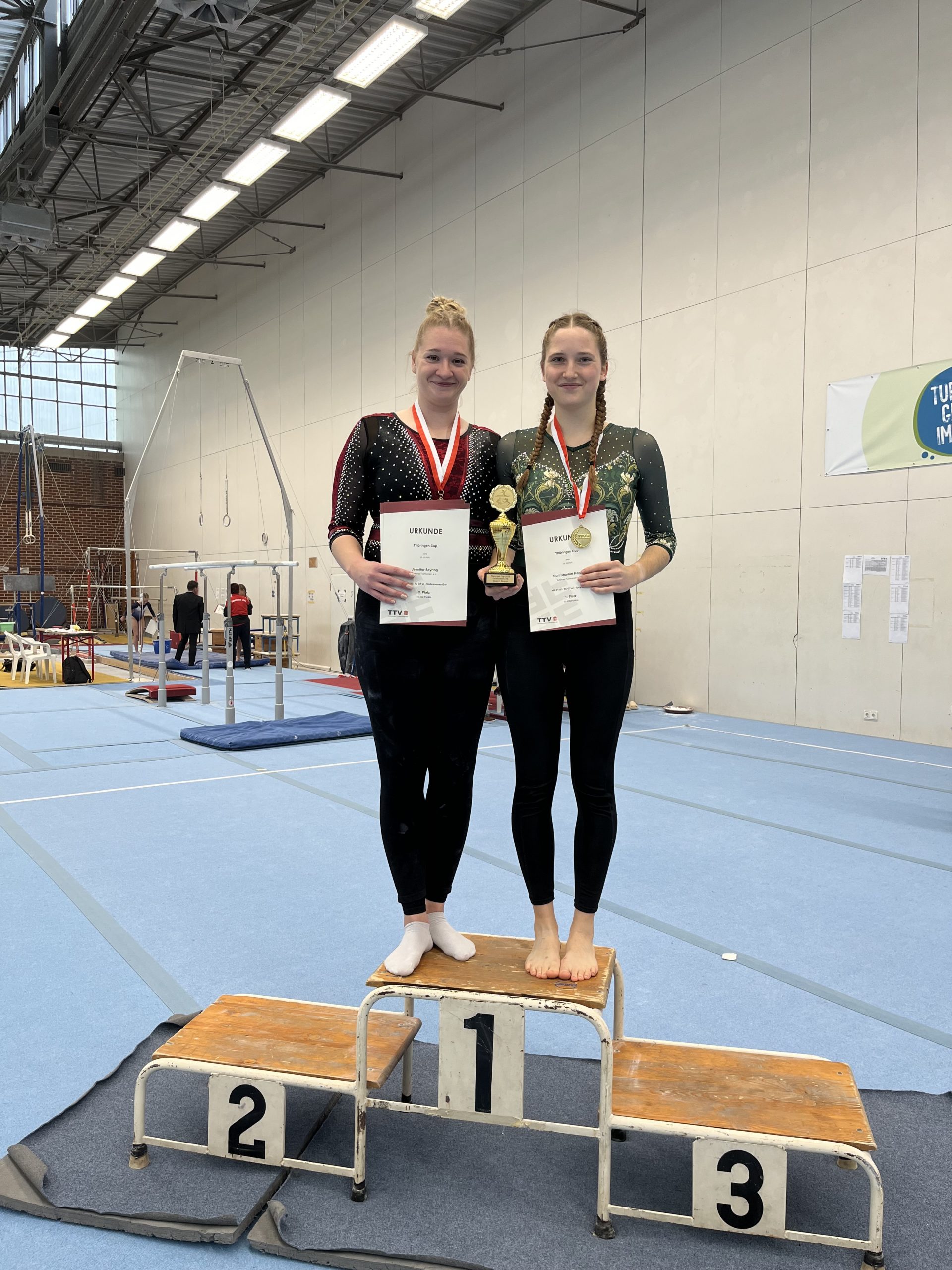 In der Klasse Ü18 wagten sich Suri Reiber und Jennifer Seyring erstmals in die höchste Leistungsklasse (LK1). Jenni zeigte solide Übungen an Sprung, Balken und Boden und glänzte besonders am Stufenbarren, wo sie den zweiten Platz belegte und damit den Titel "Vize-Landesmeisterin am Stufenbarren" trägt.
