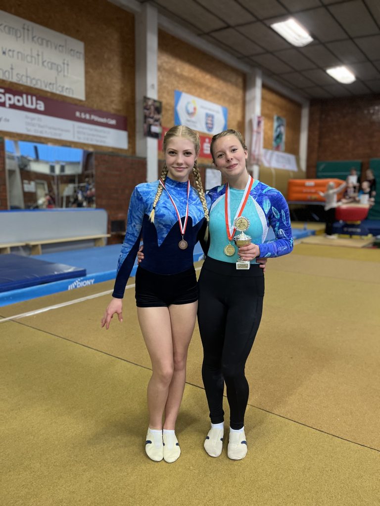 Bei den älteren Turnerinnen traten in der U18 Resi Grams und Lotta Böttner an Sprung, Balken und Boden an. Beide präsentierten sich solide, zum Podest fehlte nicht viel. Am Balken gelang Athletinnen der neue Aufgang – eine Rolle auf den Balken. Lottas sauber ausgeführter Standspagat war ein optisches Highlight, während Resi mit einer sicheren Brücke rückwärts überzeugte und sogar den 4. Platz hier belegte. Am Sprung war es dann noch knapper: hier fehlten nur 0,05 Punkte zum Treppchen.